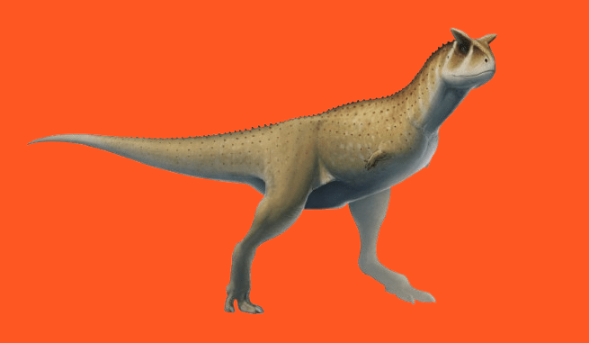 Carnotaurus was a large, carnivorous dinosaur from the Late Cretaceous period, known for its two horns above the eyes, short snout, and very small forelimbs. Carnotaurus was a swift bipedal predator, possibly hunting smaller animals or scavenging, and its skin was covered in scales with rows of large bumps along its back.